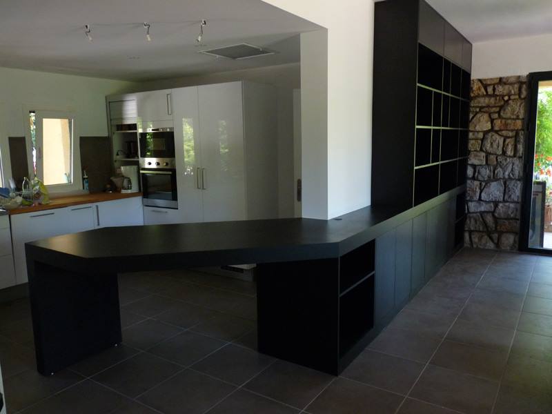Avec l'aménagement d'espace de rangement ouvert en partie haute , laissant place à l'installation de multiples objets de décorations ...