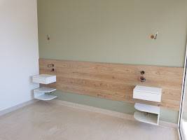 Découvrez cet aménagement de chambre composé d'une tête de lit en bois avec ses chevets suspendus et son coin coiffeuse/ dressing coordonné !
