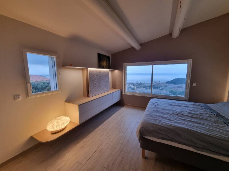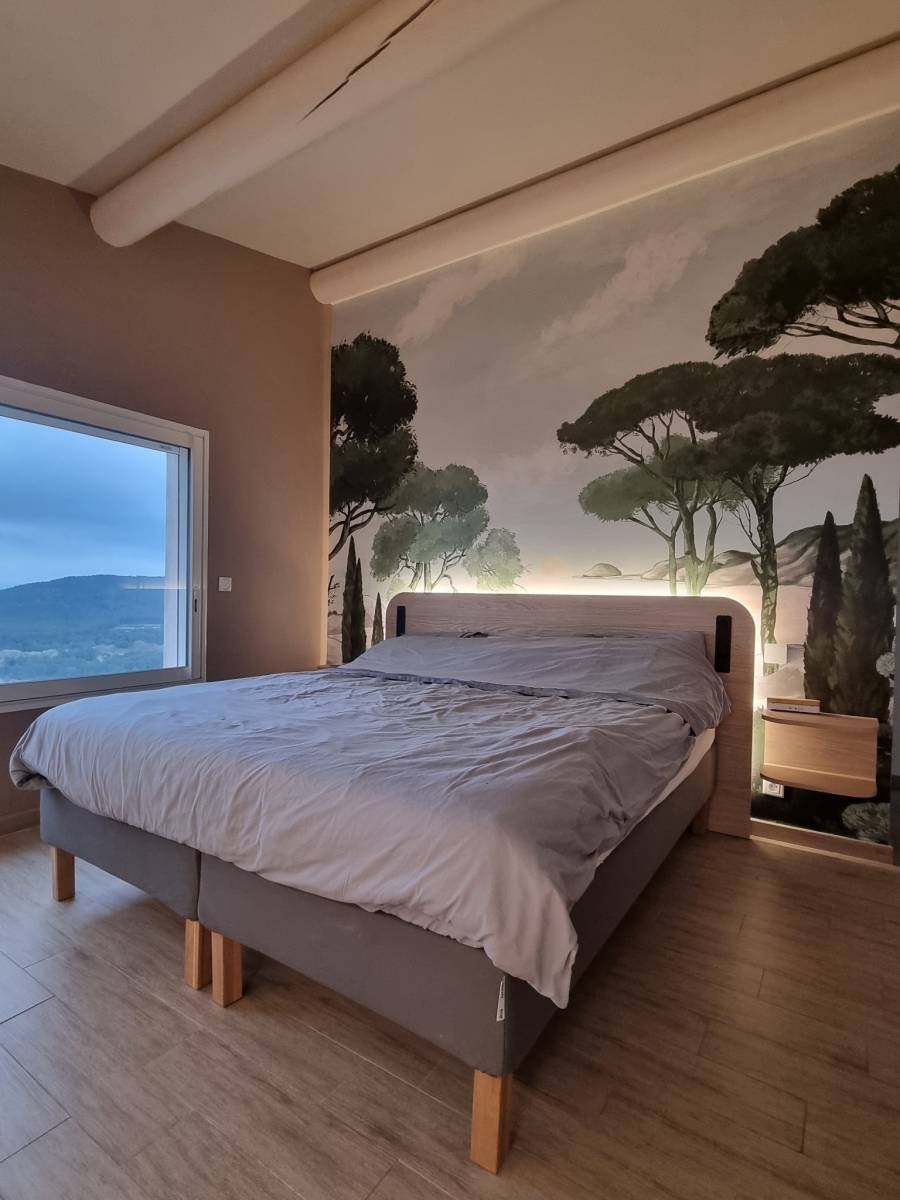De petits chevets suspendus, avec deux niveaux de rangement ont été placés à hauteur de matelas, La tête de lit accueille des liseuses discrètes ainsi que de l'éclairage indirect, en bande led, au dos de cette dernière, éclairant ainsi ce mur.