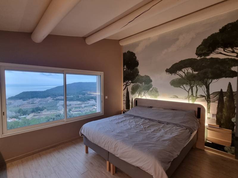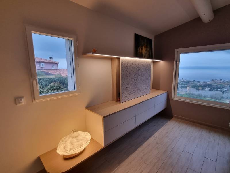 L'écran disparaît comme par enchantement, laissant place à une surface continue, lisse, qui renforce l'ambiance zen et épurée de la pièce, offrant une vue dégagée, propice à la contemplation ou au simple repos. Notre concept global pour la transformation de cette suite parentale est donc un savant mélange de fonctionnalité invisible et de design apaisant, où chaque détail contribue à cette harmonie recherchée.