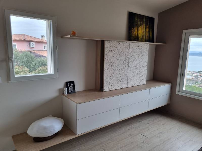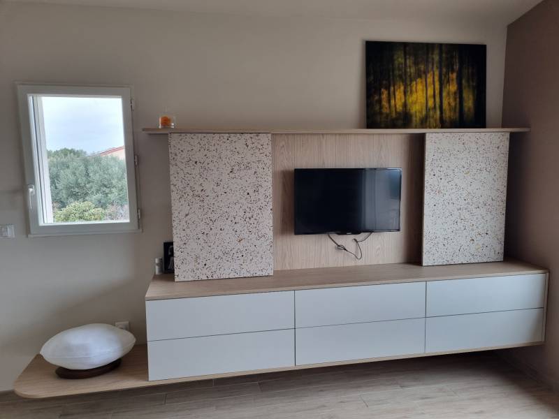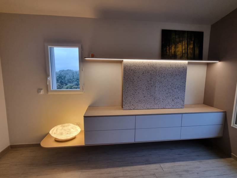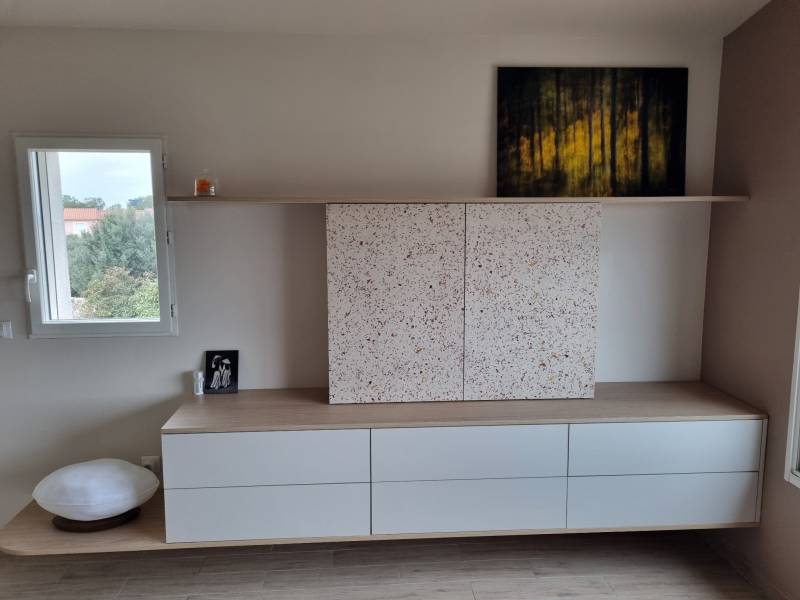 Ce n'est pas qu'un simple rangement ; Muni de tiroirs spacieux pour une organisation impeccable, il intègre surtout des portes coulissantes, réalisées dans un stratifié naturel Oberflex. Ce matériau, à la fois élégant et discret, permet de dissimuler entièrement la télévision placée sur un support mural. Une fois fermées, ces deux portes transforment l'espace, le purifiant de toute distraction visuelle.