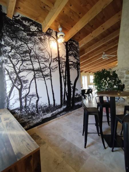 Plus au fond, l'espacé détente avec un magnifique papier peint noir et blanc, un meuble pour le frigo et cafetière et un mange debout;
