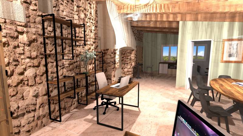 Dans une pièce à part, le bureau de co direction, avec une bibliothèque de rangements ouverts pour la mise en place de catalogues fournisseurs, et un bureau suffisamment grand pour y travailler à deux et recevoir des visiteurs.
