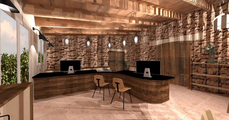 Nous avons conçu une banque d'accueil, courbe, offrant deux plateaux distincts et un espace commun dans l'angle, celle ci est retroéclairée devant pour la mise en valeur de cette courbe,