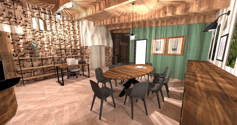 Le lieu est magique, de la pierre au sol, une belle hauteur sous plafond avec des poutres apparentes, et de vieilles portes en bois avec quincaillerie en métal noir apparente;