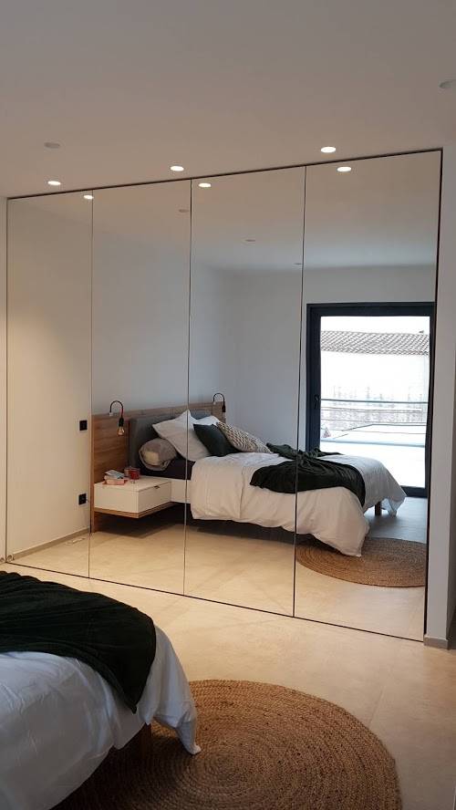 Les portes de ces aménagements, ouvrantes à la française, sont pourvues de miroir argent ou gris toute hauteur, les ouvertures se font par touche lâche, et leur intégration est parfaite dans l'ambiance chaleureuse des chambres. Un côté chic et sobre, avec ses miroirs, les dressings sont parfaitement intégrés dans leur environnement.