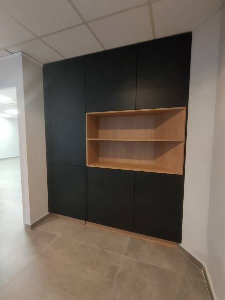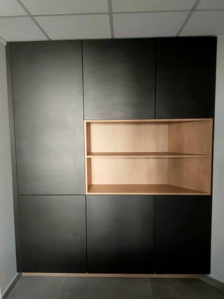 Pour la direction des ressources humaines, la fonctionnalité était primordiale, puisque le rangement des classeurs, archives et autres documents confidentiels, devais se faire, dans des colonnes modulables ( tablettes réglables en hauteur sur taquets amovibles) mais aussi, devait se fermer à clé; Des niches décoratives viennent amener de la légèreté à l'ensemble;