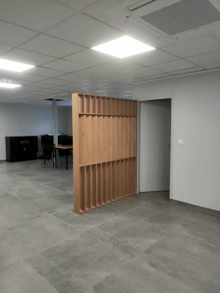 Les claustras séparatifs ont été créés dans la même essence de bois, ici, chene de kendal huilé, avec en parties haute et basse, des tasseaux fixes, et au centre, une partie amovible afin de pouvoir les faire évoluer selon la mise en place et/ou la circulation de ce plateau, au nombre de trois, ils ont été créés sur mesure pour s'aligner soit à la hauteur des portes soit des faux plafonds;
