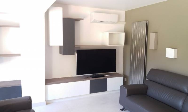 Côté banc tv on ajoute un soupçon de gris ! et toutes les lignes sont mises en valeur ! des caissons verticaux pour le rangement des dvd ou cd, (qui répondent à la poutre traversant le séjour) et des portes pour cacher les éléments box, lecteur ou console sous le banc.