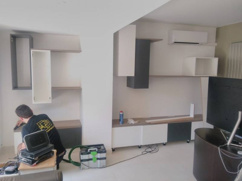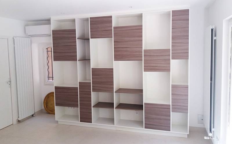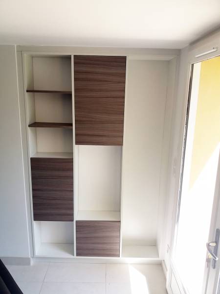 Projet très sympa ! Un espace salon tv bibliothèque :tout aéré et pourtant du rangement en grande quantité : ouvert et fermé ! structure blanche pour l'espace bibliothèque et portes en driftwood (bois grisé très tendance);