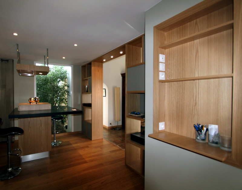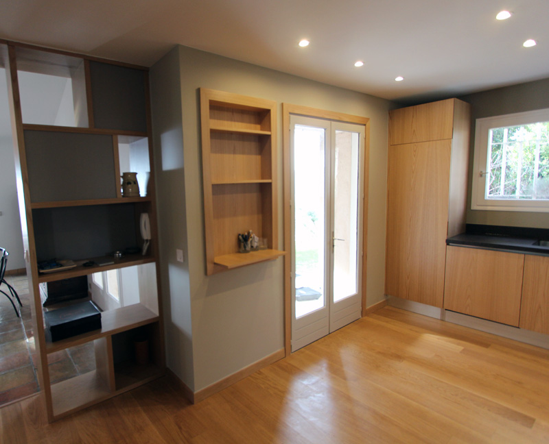 Cette bibliothèque crée un lien entre la salle à manger et la cuisine, elle a permis de changer le sol de la cuisine (ici parquet massif chene) et de créer une séparation visuelle tout en intégrant une touche de modernité dans cet espace.