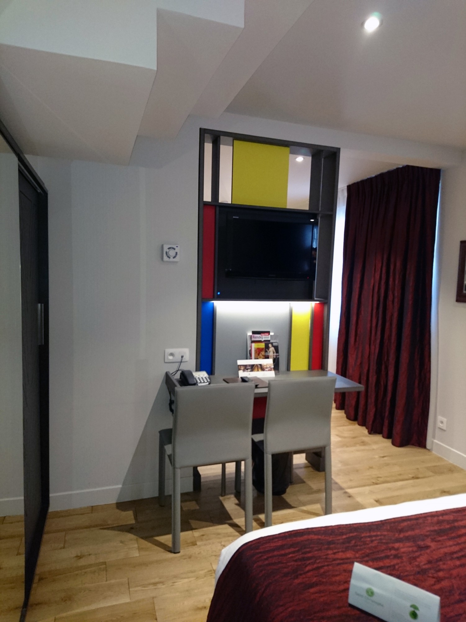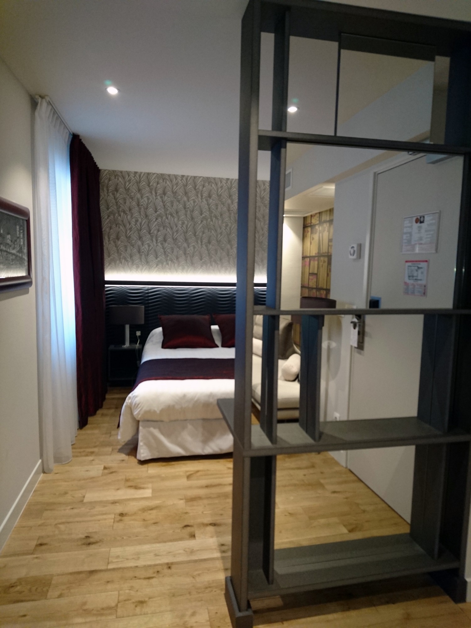 Un meuble central, faisant office de séparation comprend un espace tv + bureau d'un côté et des miroirs de l'autre côté pour un accueil chaleureux.