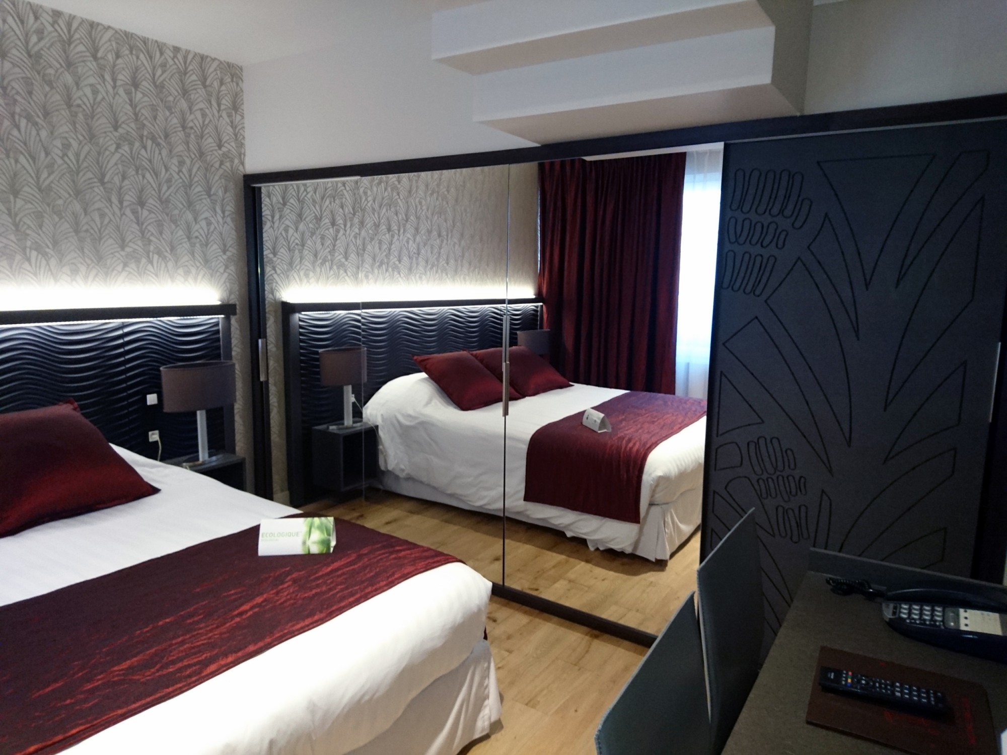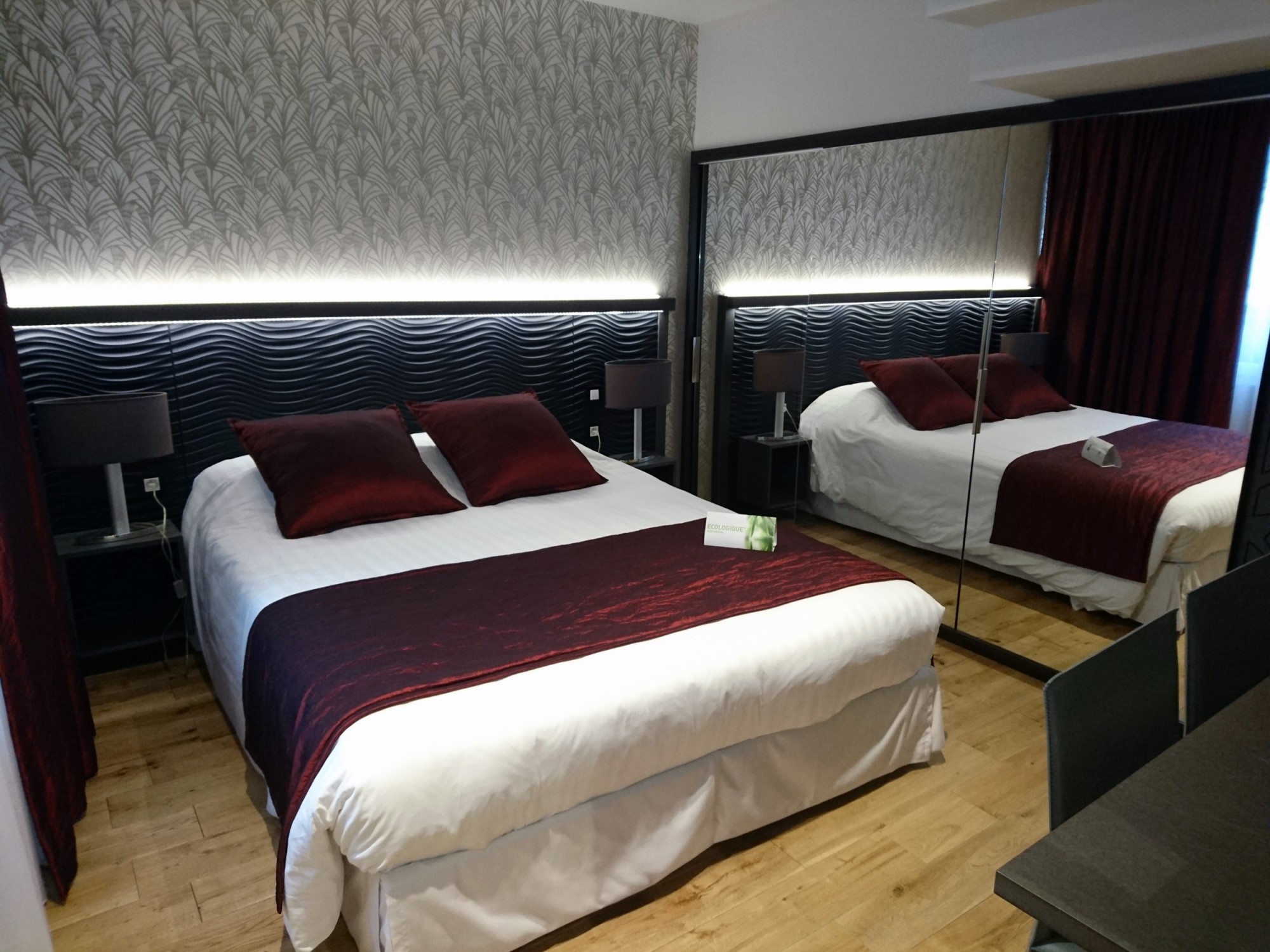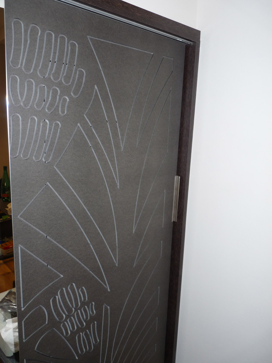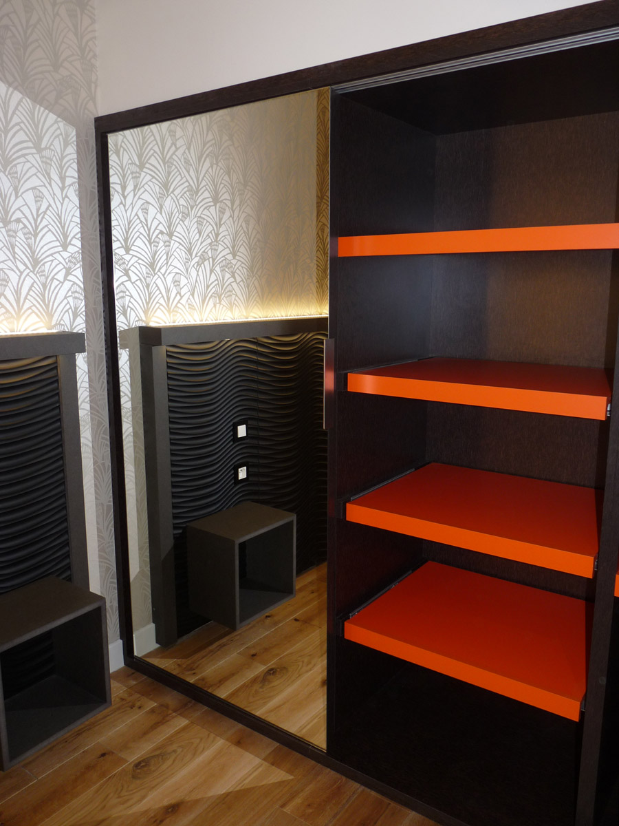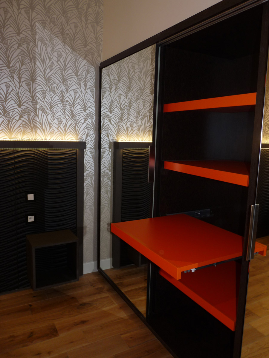 Ici nous avons fabriqué un aménagement de penderie, avec des portes coulissantes 3 en miroirs et une en médium valchromat gris anthracite reprenant le motif de la tapisserie de la tête de lit.
