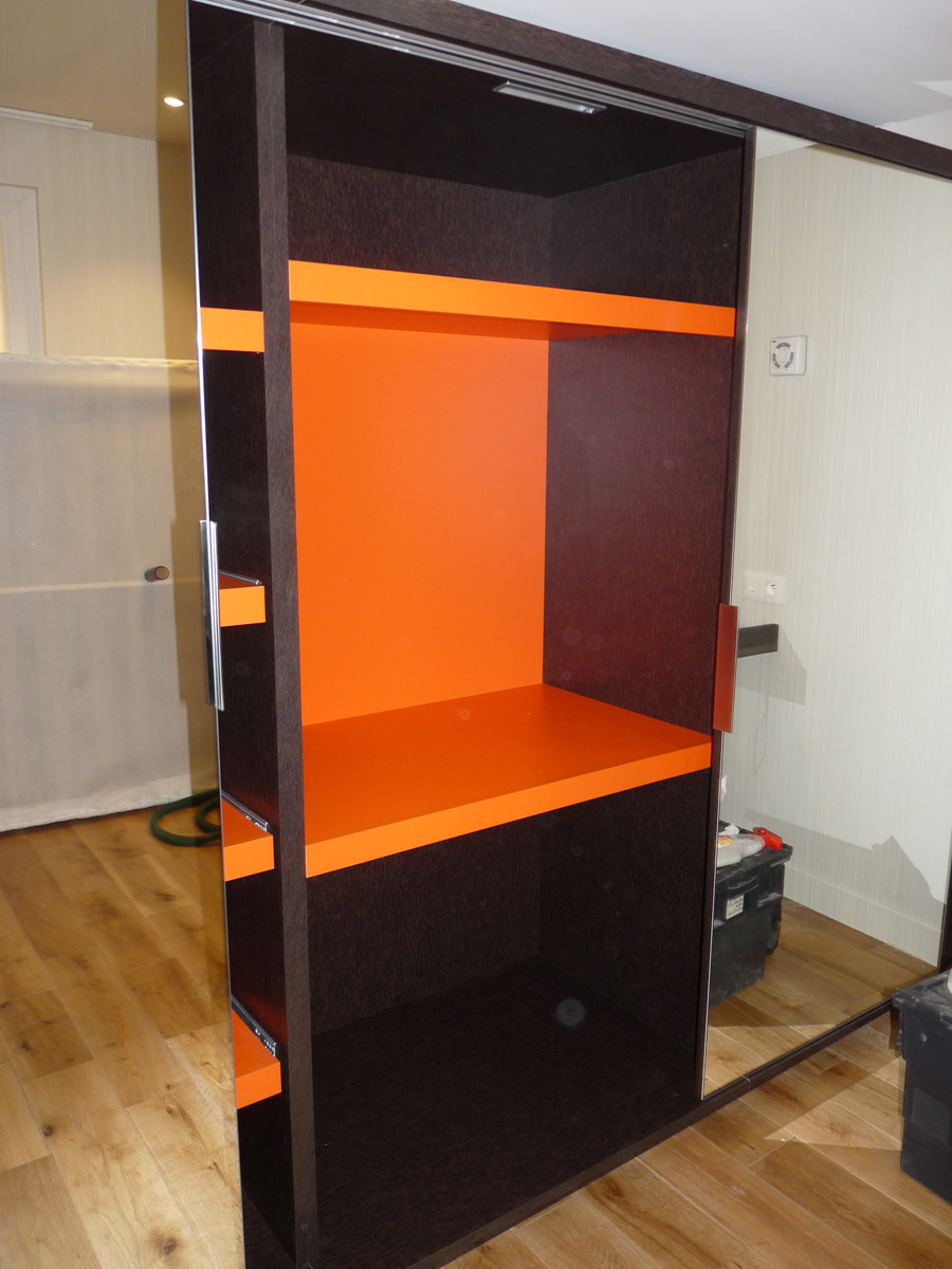 L'intérieur est en bois foncé coco et tablettes oranges!