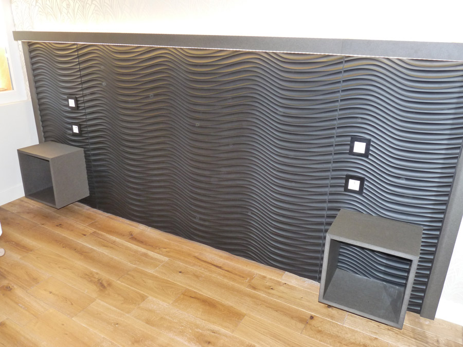 La tête de lit a été confectionnée avec un panneau MDF gougé, teinté en noir et vernis, nous y avons incorporé l'accastillage électrique ainsi que les chevets suspendus, des bandeaux leds ont été intégrés vers le haut pour éclairer le mur et vers le bas pour mettre en relief le panneau gougé.