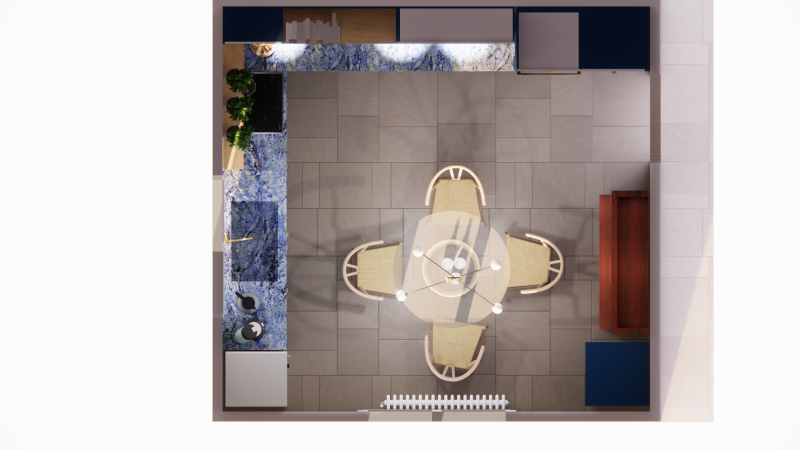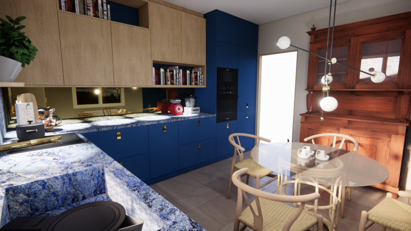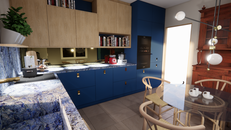 - Plan de travail en granit: Le plan de travail en granit bleu apporte une touche de sophistication et de modernité à la cuisine. Sa résistance aux taches et aux rayures en fait un choix pratique pour un espace de travail intensif.
