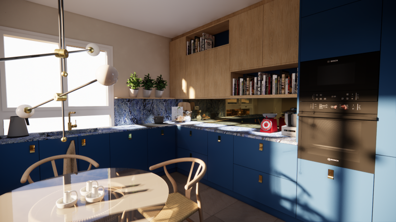 - Métal: Les poignées métalliques dorées ajoutent une touche de luxe et viennent contraster avec le bleu des façades.