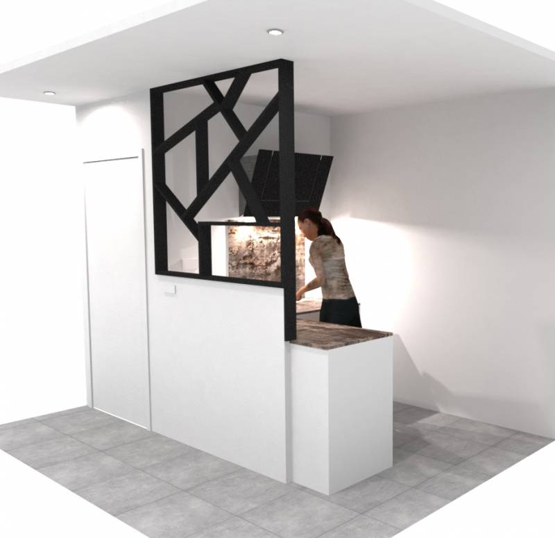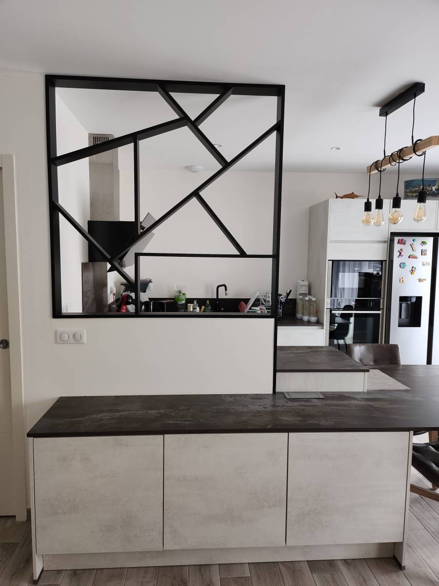 Nous avons donc conçu et imaginé un claustra séparatif en noir mat, cette couleur rappelle le look industriel déjà établi au sein de cette maison, comme vous pouvez le voir sur le luminaire de la cuisine ;