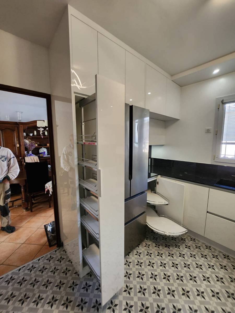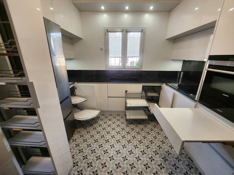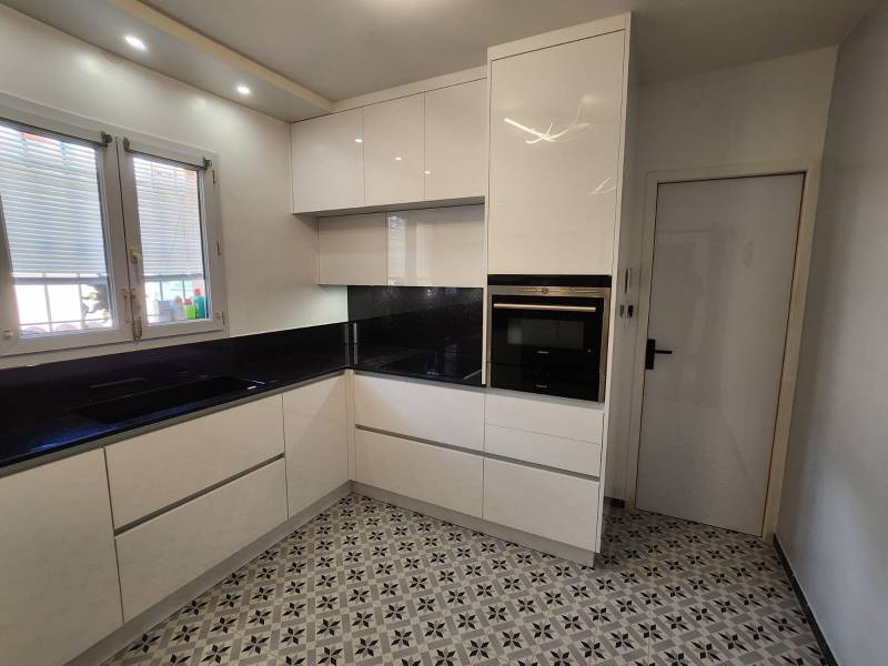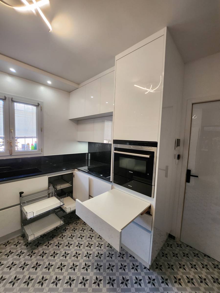 Cuisine contemporaine en U, agencée avec soin pour optimiser l’espace tout en conservant une esthétique épurée. Les façades de meubles, en finition laquée blanche brillante, apportent une grande luminosité à l’ensemble, accentuée par l’éclairage LED intégré dans le faux plafond.