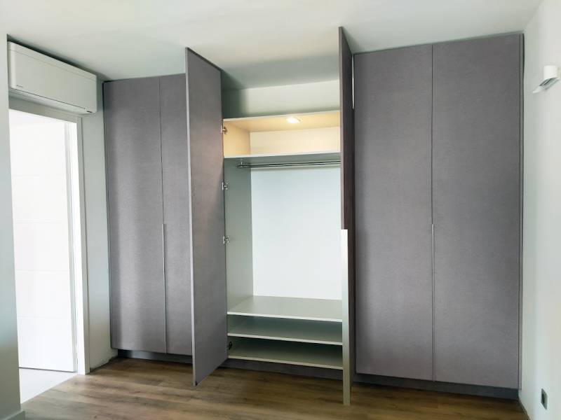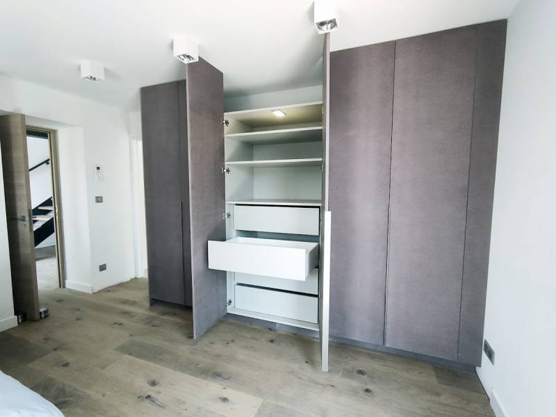 Pour conserver le côté contemporain de la maison, les portes sont ouvrantes à la française, avec poignée alu en prise de main grande hauteur; Elles ont été fabriquées en medium gris clair teinté dans la masse, en finition brute;