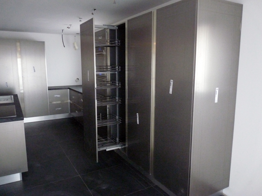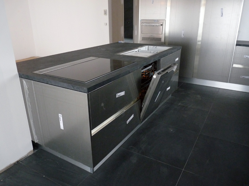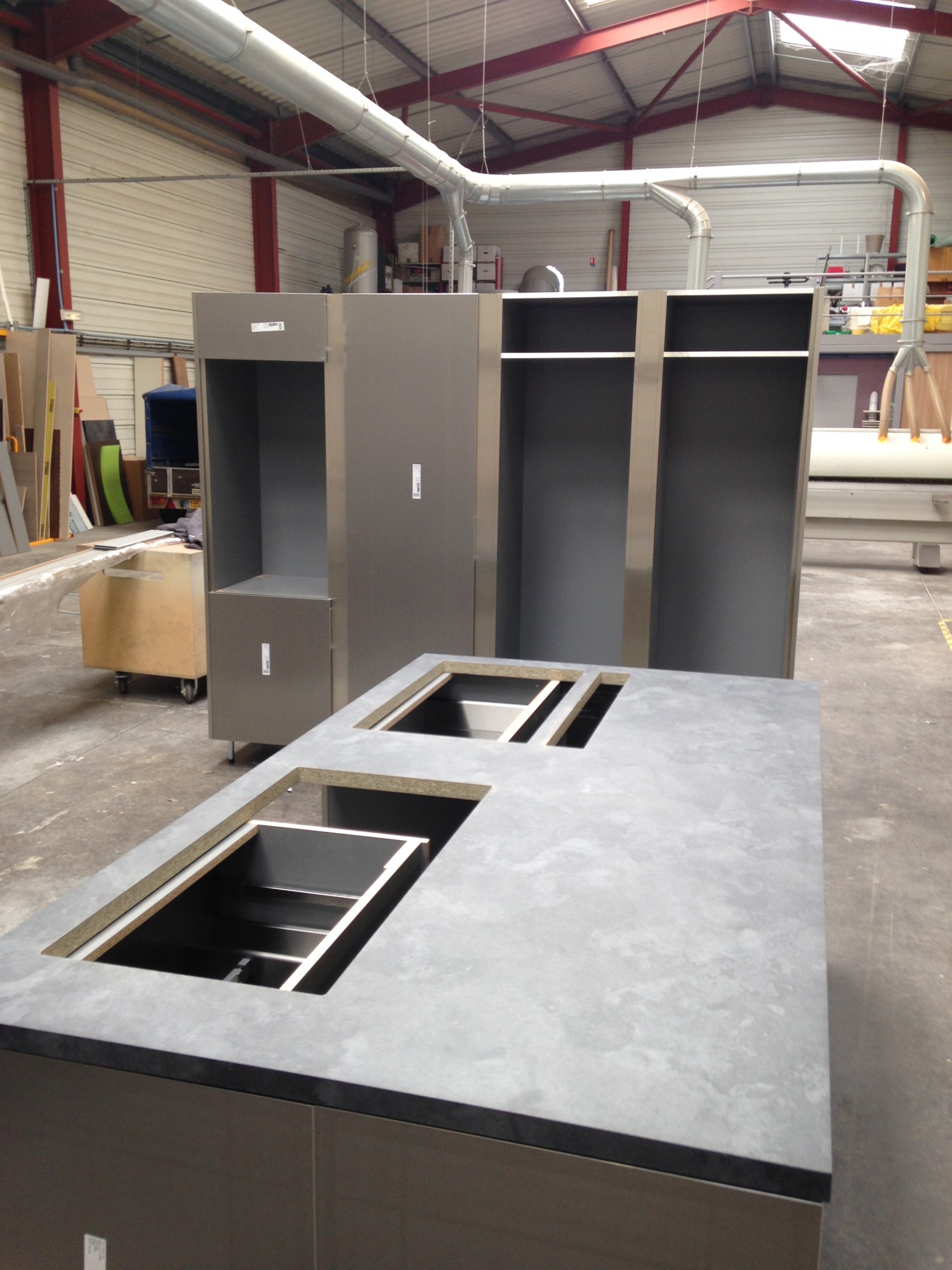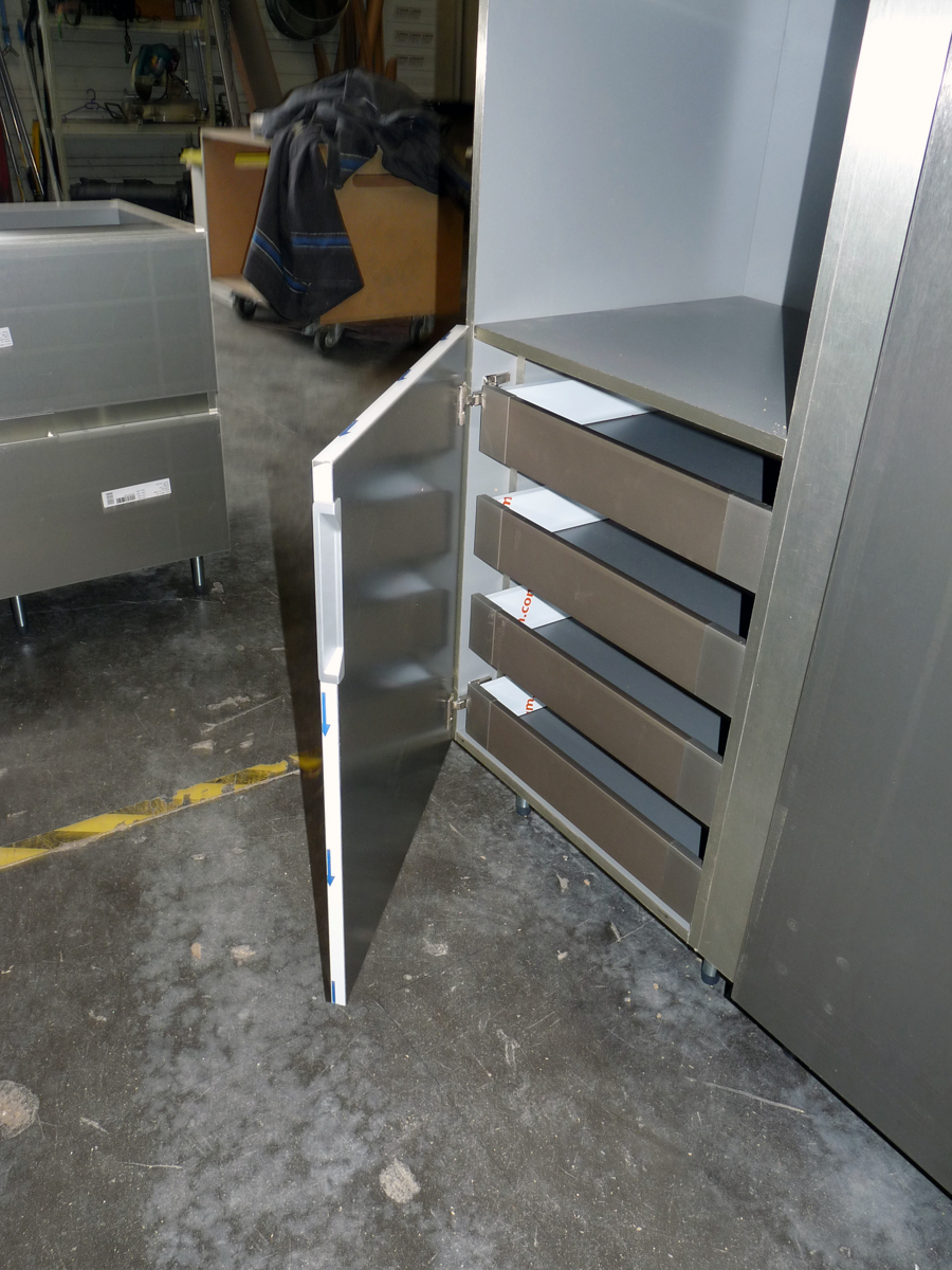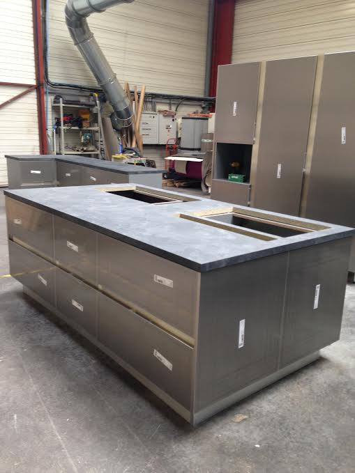 Entièrement fabriquée et pré montée dans notre atelier, cette demande du client est pourtant rare : une cuisine toute inox.