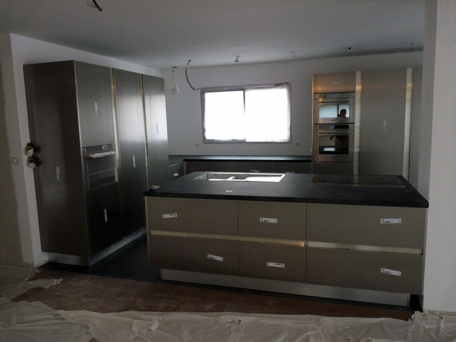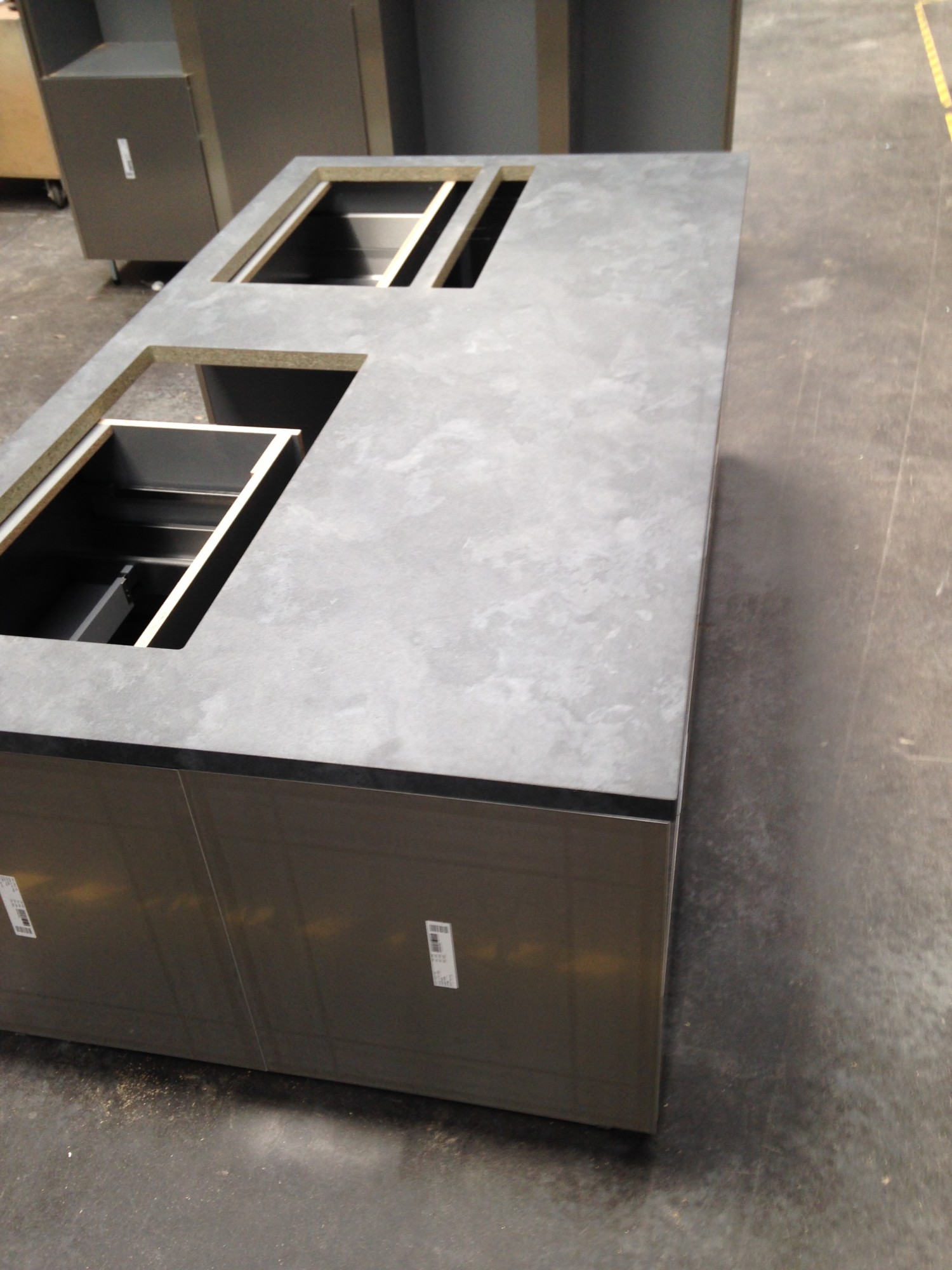 Un ilot central avec un plan stratifié dans un decor pierre de lave de chez polyrey, grande largeur sans joint comprend l'évier, une hotte escamotable avec un moteur déporté, un lave vaisselle et des tiroirs de rangement avec ralentisseurs de fin de course intégrés.