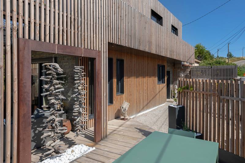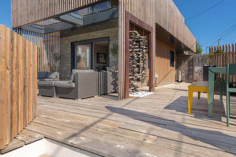 Le choix du bardage en douglas en claire-voie naturel souligne l'élégance de cette réalisation, offrant une harmonie parfaite avec l'environnement côtier. Aucun détail n'a été omis, de l'intérieur à l'extérieur, dans cette réalisation où le bois est omniprésent, apportant chaleur et authenticité.