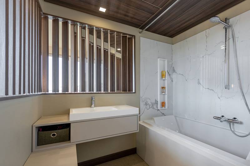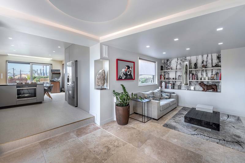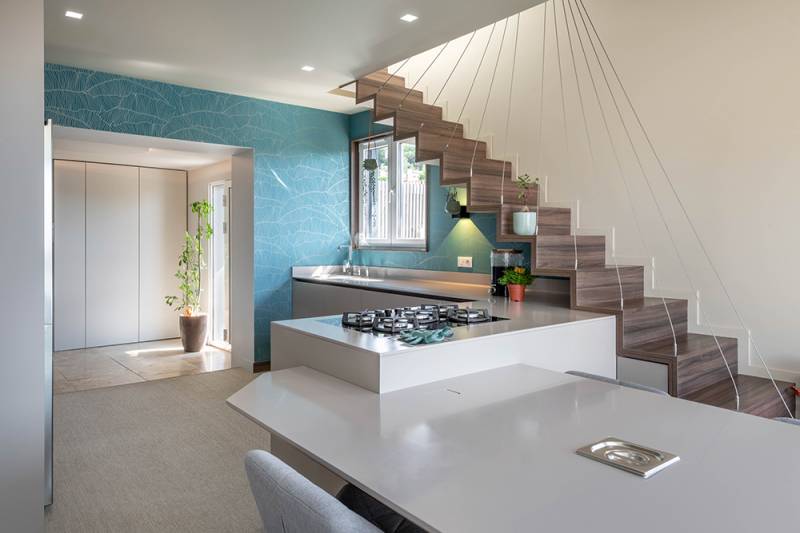 Pour créer une atmosphère unique rappelant le bord de plage, la terrasse a été réalisée en bois de coffrage, créant un contraste saisissant avec la pierre du pignon avant et le compact gris anthracite de la casquette. À l'intérieur, le mariage subtil de matériaux nobles tels que le travertin en format 60*90 et le revêtement de sol souple en Bolon, une imitation sisal en plastique, crée une ambiance chaleureuse. Les tons naturels, tels que le beige, la ficelle et le noyer, se marient harmonieusement avec les murs aux tons galets et camel.