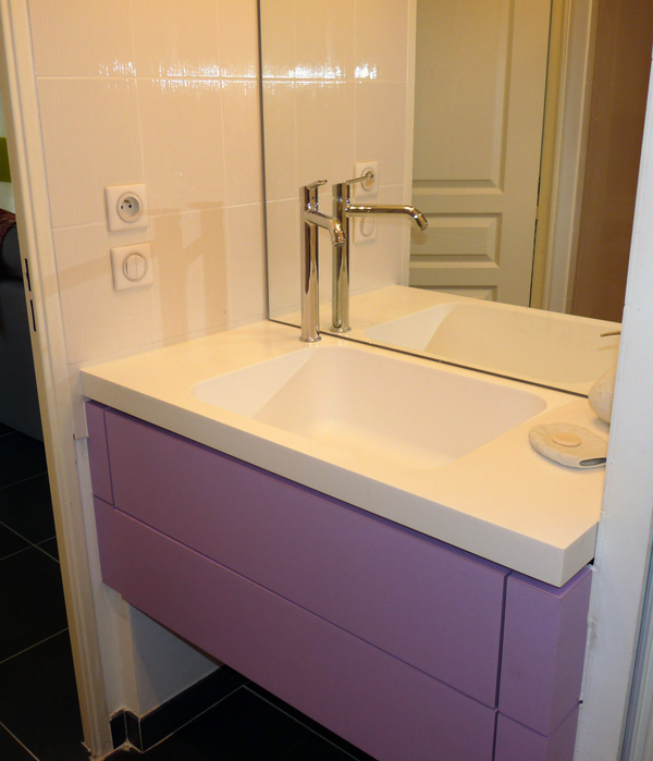 en corian pour le plan et portes stratifiées, meuble complémentaire de rangement au dessus des wc , coloris coordonné