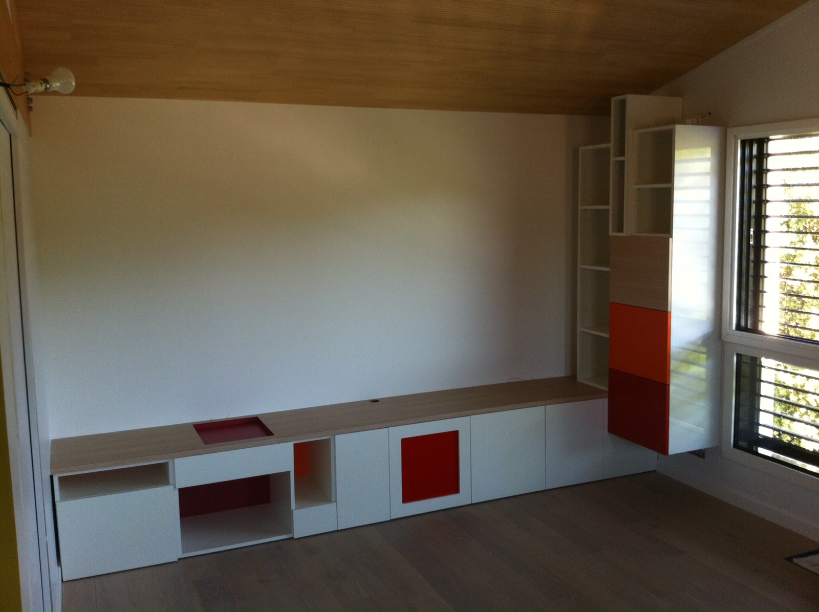 Sur la première image, Ici un grand cadre en chêne naturel vernis, desaxé vient créer un rythme décalé sur un banc plus classique avec des portes bois et grises;