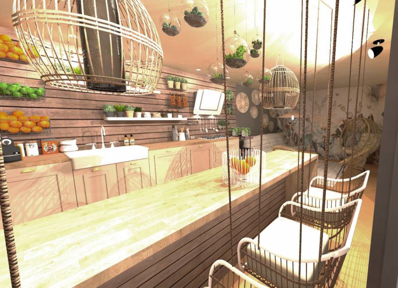 Afin d'apporter un peu d'originalité, les tabourets de bar ont été remplacés par des balançoires suspendues devant le bar.