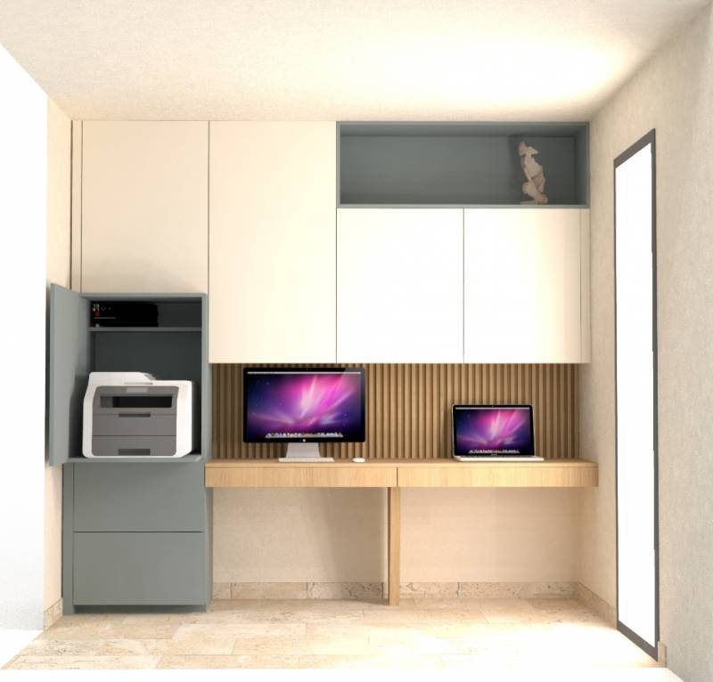 Dans l'accès à la suite parentale, un espace bureau pour deux personnes, avec imprimante, box, dossiers suspendus, et rangements classeurs, un peu de couleur et de lumière pour rendre l'espace agréable et fonctionnel;