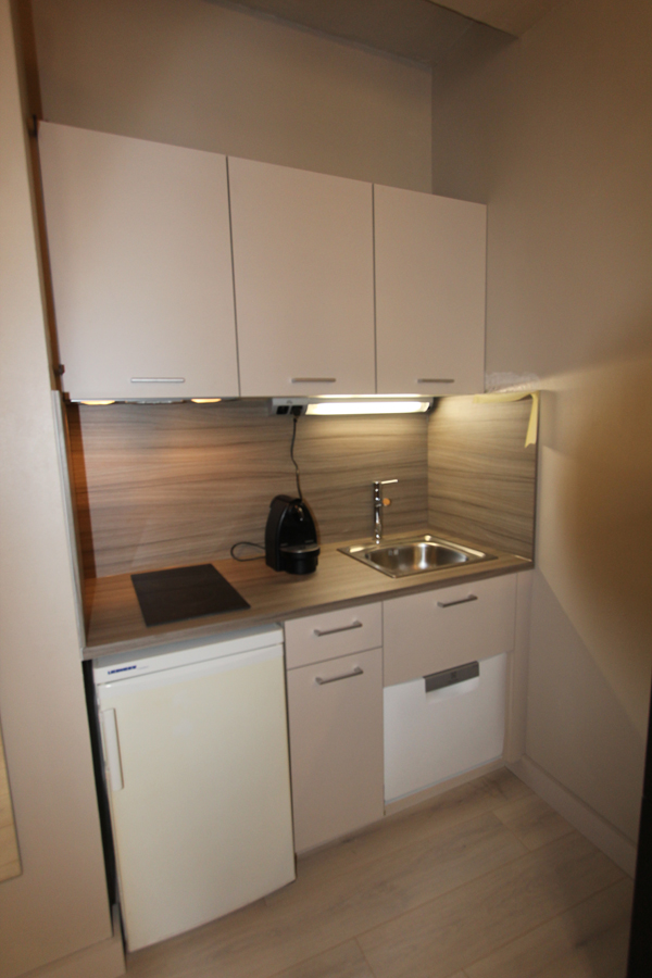 Fabrication d'une cuisine sur mesure dans un espace réduit, la crédence en vieux carrelage a été remplacé par un stratifié au ton bois et des façades unies créent un espace fonctionnel et agréable; intégration de tout l'électroménager nécessaire : plaque de cuisson avec hotte à recyclage, micro ondes, un mini lave vaisselle, un éclairage d'angle avec prise intégrée.