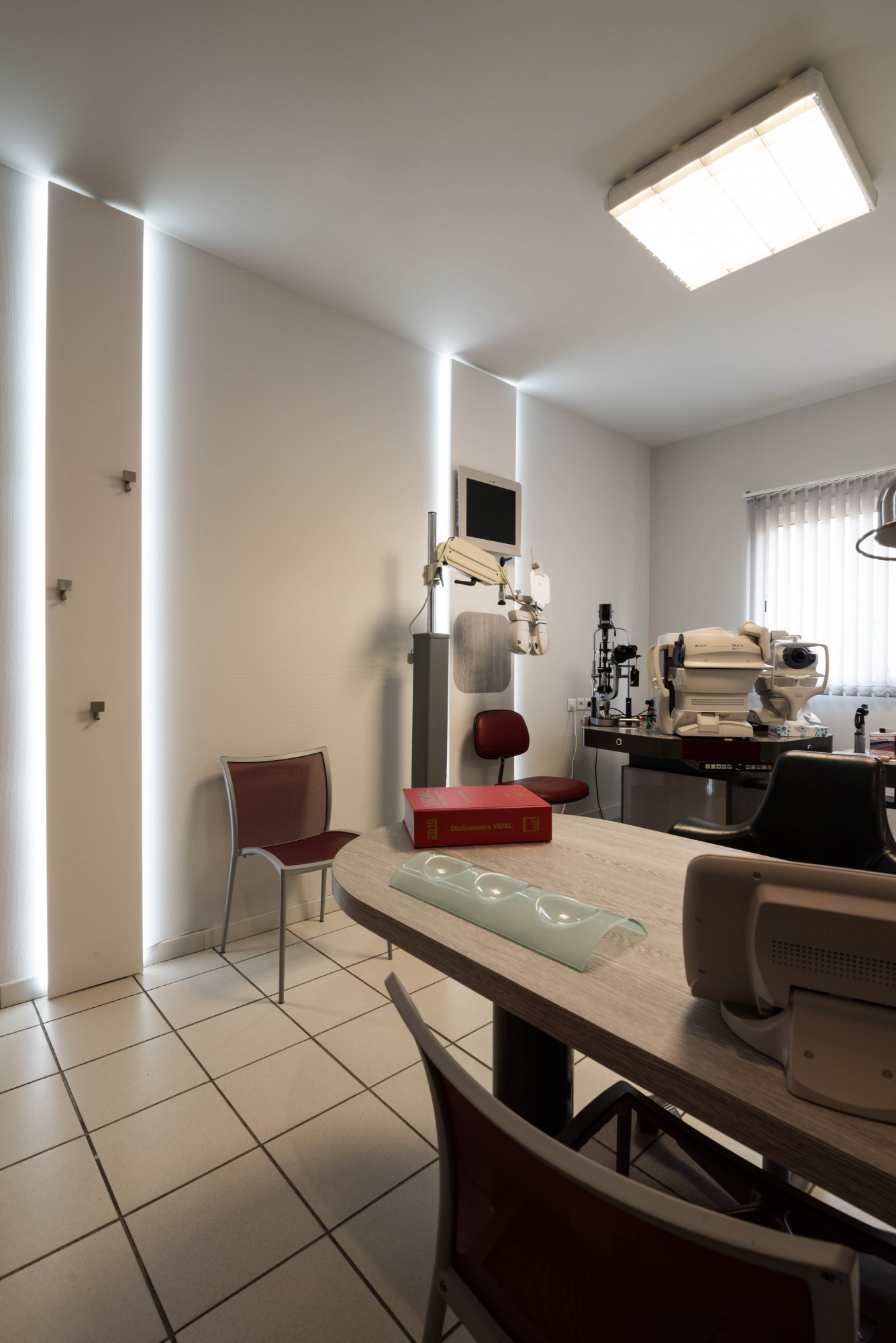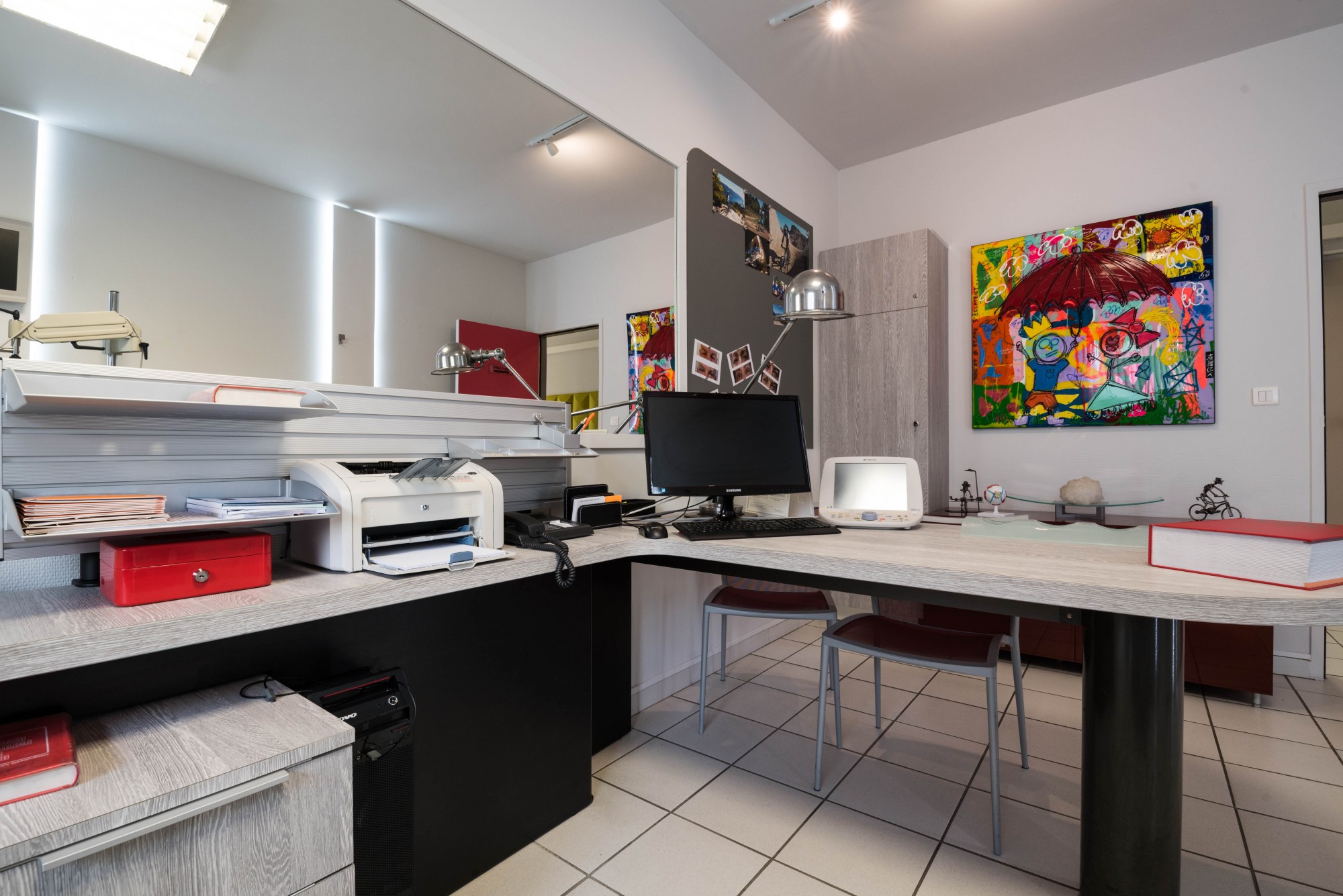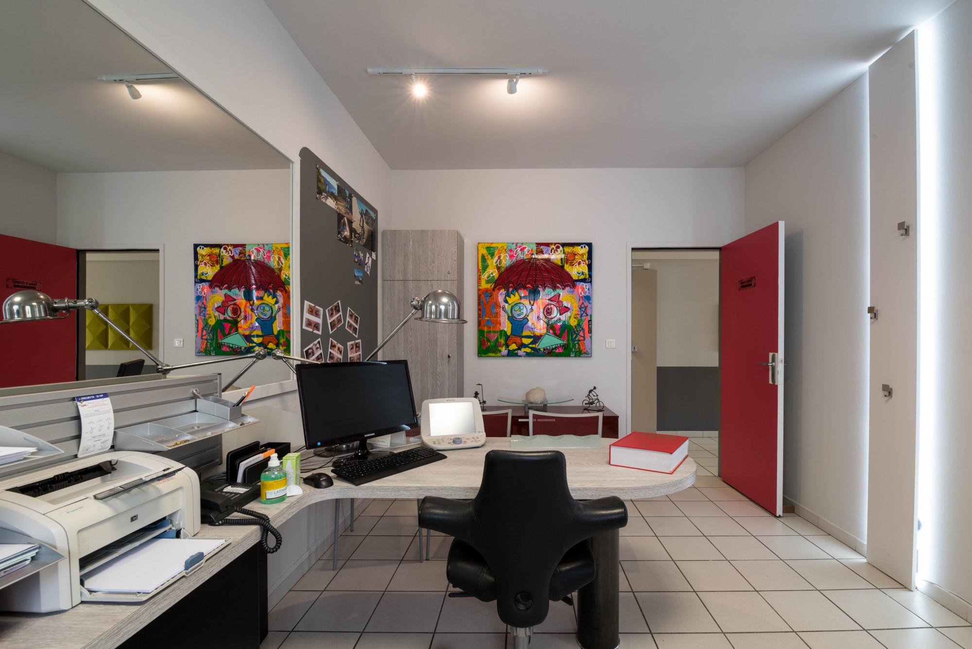 Pour la partie bureau, nous avons réutilisé l'ancien, et avons changé uniquement le revêtement stratifié, le piétement central de celui ci permet une bonne aisance au praticien, et ne souhaitait pas en changer.