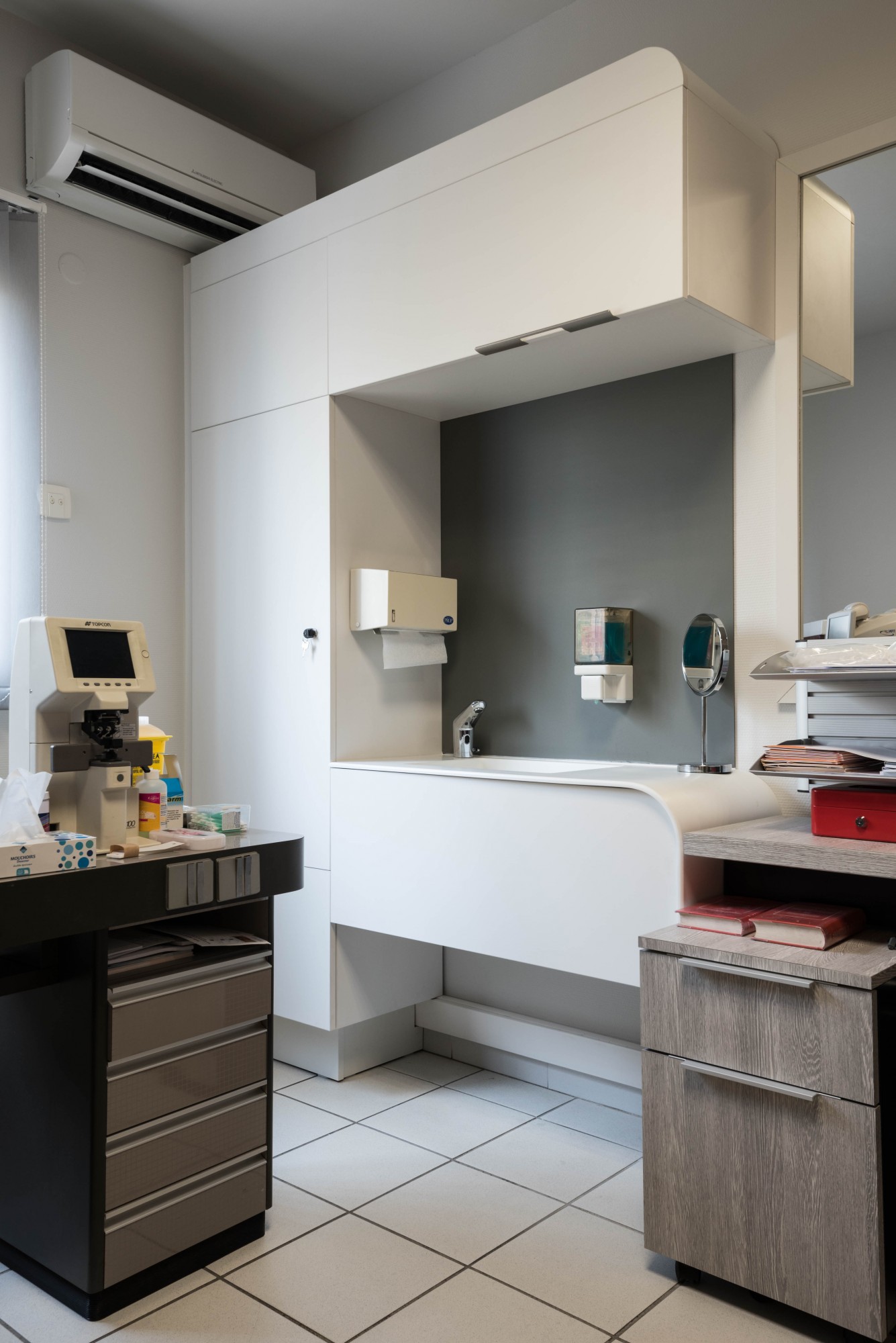 Pour la partie technique, le plan a été réalisé en corian (matériaux qui lie la pierre à de la résine) et thermo formé pour donner une courbe à son extrémité, l’évier est parfaitement intégré par le dessous, sans joint, l'avantage de l'utilisation du corian dans cet espace est pour son coté anti bactérien et hautement hygiénique, permettant de garder un espace de travail parfaitement propre pour la patientèle.