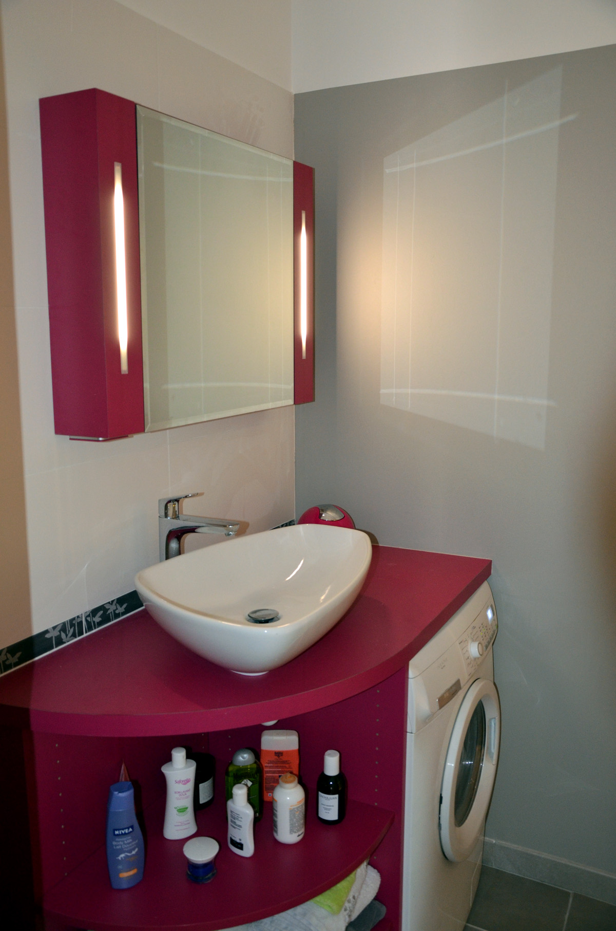 Le plateau supérieur a été travaillé en courbe sur l'extrémité pour une meilleure intégration, sous le plan nous avons pu glisser le lave linge et quelques tablettes de rangement,