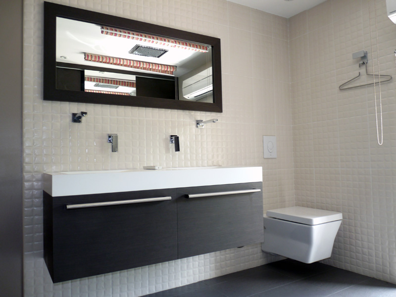 Le plan vasque double pente a été créé en solid surface avec les mitigeurs encastrés au mur,