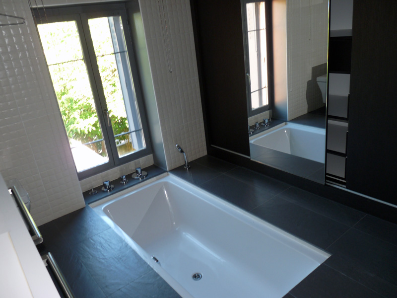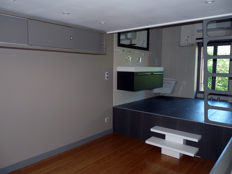 Salle de bain montée sur un demi niveau, permettant d'intégrer d'un côté le plan vasque et le wc, au milieu une trappe se coulisse pour faire apparaître la baignoire,