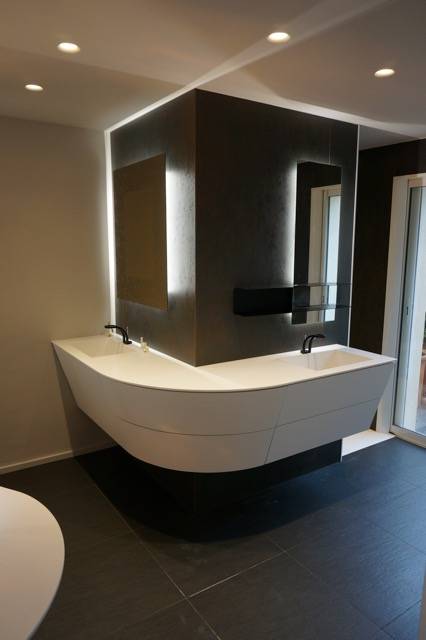 Pour la salle de bains attenante, nous avons conçu un meuble suspendu, sur mesure, avec un plateau en Corian blanc. Ce matériau haut de gamme, résistant et esthétique, intègre deux cuves sous plan pour une finition épurée. Les tiroirs, quant à eux, sont dotés de façades à pans coupés avec ralentisseurs de fin de course, offrant ainsi une ouverture et une fermeture en douceur. Un miroir avec éclairage LED intégré complète cet ensemble, apportant une luminosité agréable et fonctionnelle.