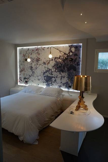 Le meuble séparatif, avec son plan en Corian et ses façades laquées blanches mates, sert à la fois de rangement et de séparation discrète entre les espaces. Au cœur de cette suite parentale avec tête de lit sur mesure se trouve une tête de lit courbée, laquée en blanc mat, qui encadre un papier peint Glamora "Cloud". Ce choix décoratif, associé aux appliques "monte et baisse" de Daniel Gallo, crée une ambiance à la fois moderne et apaisante.