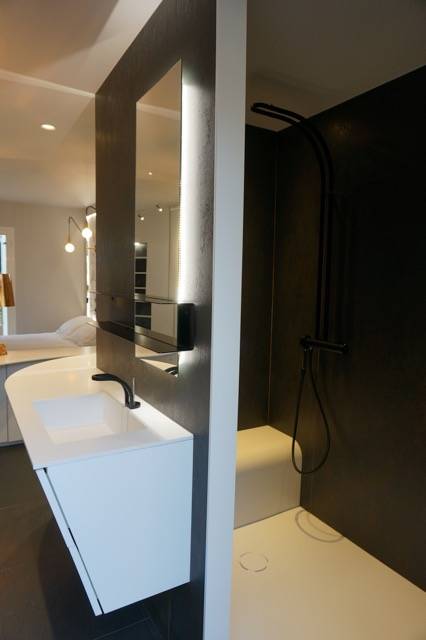 La douche, conçue pour le confort et l'esthétisme, est équipée d'un receveur en Corian, accompagné d'un banc intégré en Corian thermoformé. Les carreaux grands formats (1x3 mètres) effet rouille de chez Porcelanosa renforcent l'aspect contemporain de l'ensemble.